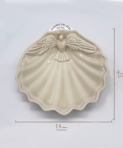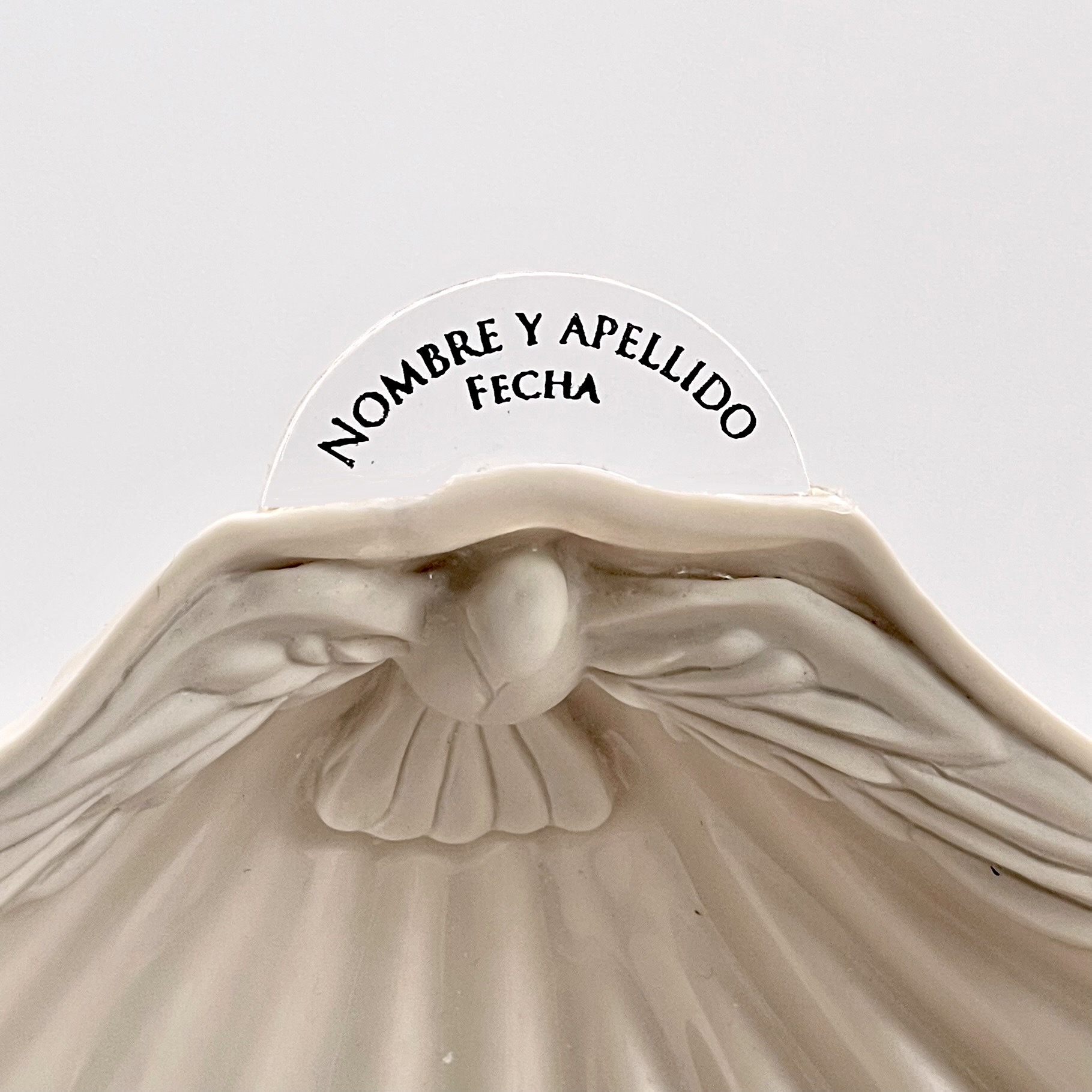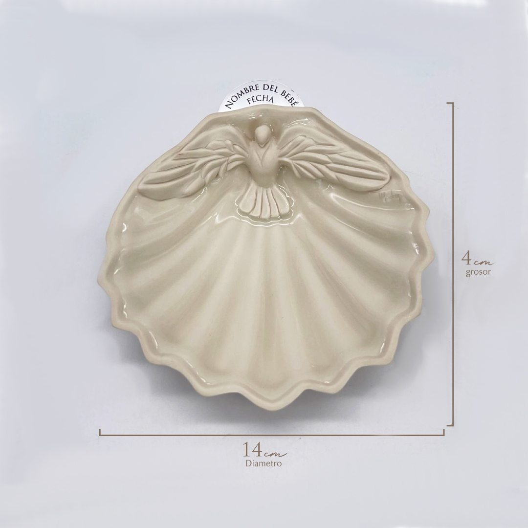 Esta concha fue diseñada recaudando muchos simbolos importantes en el sacramento del bautismo. El primero es la concha en si que desde el inicio del cristianimso ha simbolizado el bautizo. El segundo es la paloma, recordandonos el día del bautiso de Jesús en el que el cielo se abrio y el espíritu de Dios bajo en forma de paloma a postrarse sobre el, (Mateo 3, 15-17). El tercero, no podía faltar el espacio para el nombre y fecha del bautizado, el cual es sagrado y para toda la eternidad.
